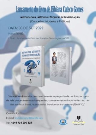 A Academia de Ciências Sociais e Tecnologias convida à Comunidade Académica para o lançamento do livro “Metodologia, Método de Técnicas de Investigação: Conceitos, Modelos e Práticas”, da autoria de Bibiana Cateco Gomes, no dia 30 de Setembro, às 16 horas.